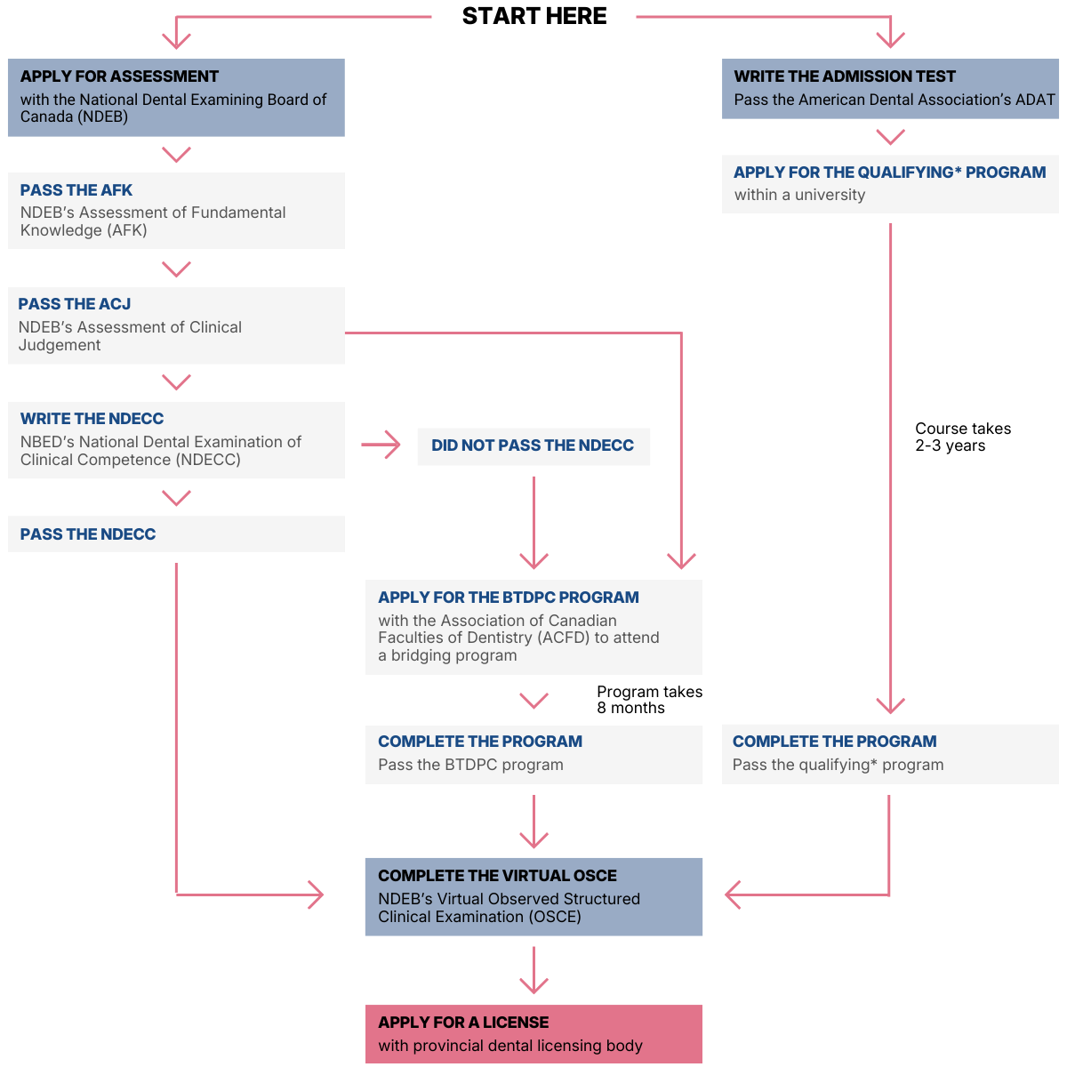 Trainees who complete the BTDPC program for the 2026–2027 cohort and afterwards will no longer be required to write the NDECC. Instead, trainees will be eligible to move directly to the Virtual OSCE with the National Dental Examining Board of Canada (NDEB), and then apply for licensure to practice dentistry in Canada.